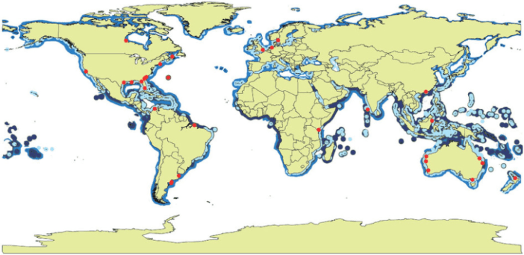 Figure 1: Global distribution of vegetated coastal ecosystems and documented cases of overgrazing, defoliation, and extreme bioturbation events in these systems.