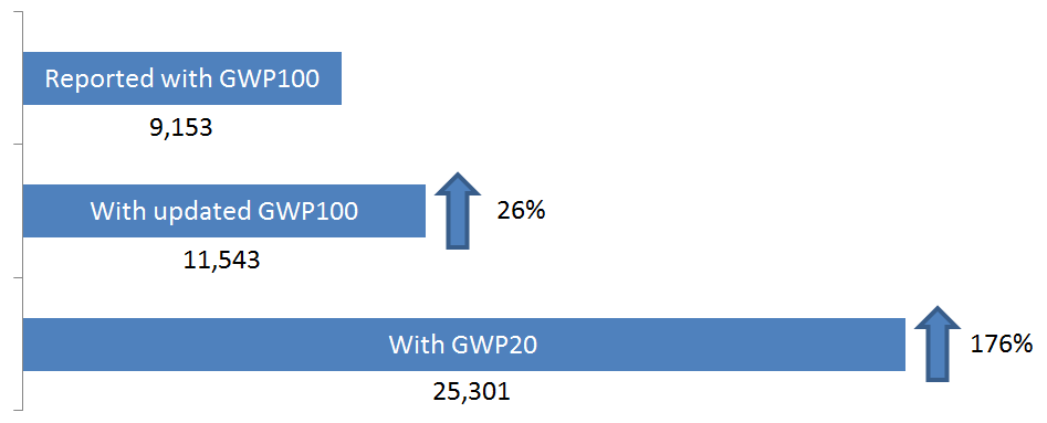 Based on an alternative 20-year time horizon, the GWP multiplier for methane increases from 34 to 86.