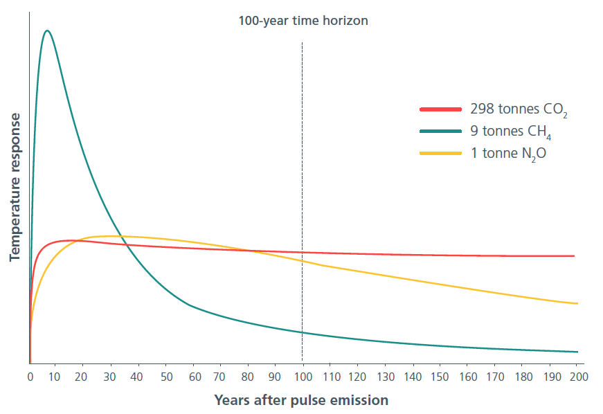 Figures 1(a) and (b) compare the effects of one-off emission pulses of CO2, CH4 and N2O. [2] The size of each pulse reflects the amount of the relevant gas required to achieve the same level of warming as one tonne of N20 (the most potent of the three) over a 100-year time horizon. Up to the 100-year point, the area under each curve is equal, indicating an equal amount of warming. [Footnote 1]