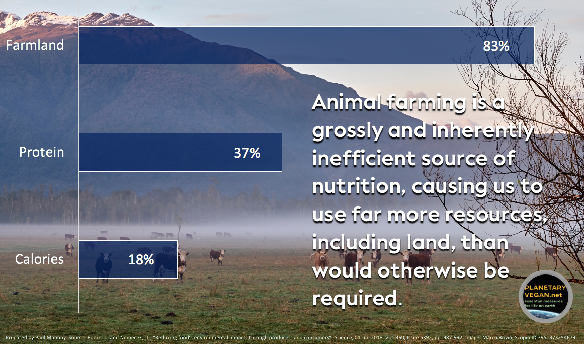 The issue also applies to non-animal forms of agriculture but is accentuated in animal agriculture due to the grossly inefficient nature of the activity. The inefficiency causes us to use far more resources, including land, than would otherwise be required.