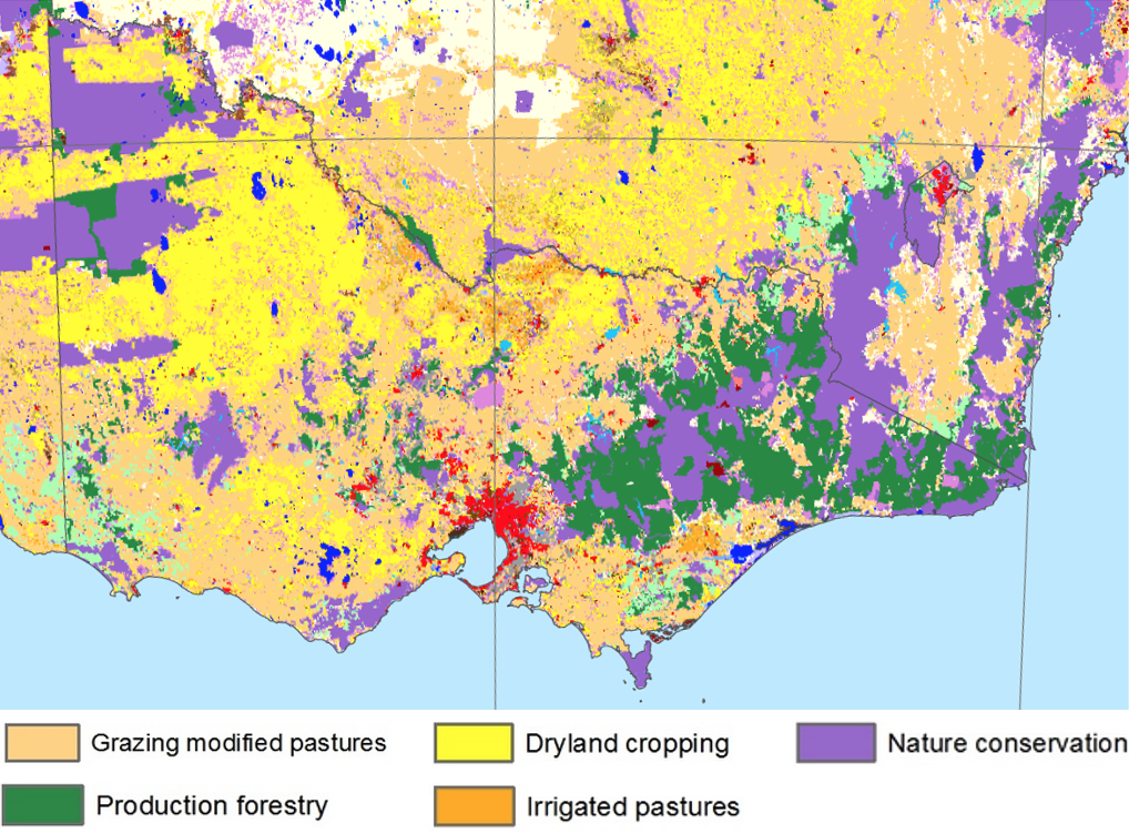 Around 66 per cent of Victoria’s native vegetation has been cleared since Europeans arrived, leaving 34 per cent of its land area covered by native forests. [24] [25] The cleared area is roughly equivalent to the area of Ireland, Switzerland and Netherlands combined. In percentage terms, it makes Victoria Australia’s most heavily cleared state. [26] The major uses of the state’s lands, including farmed animal grazing, are shown in Figure 7. [27]