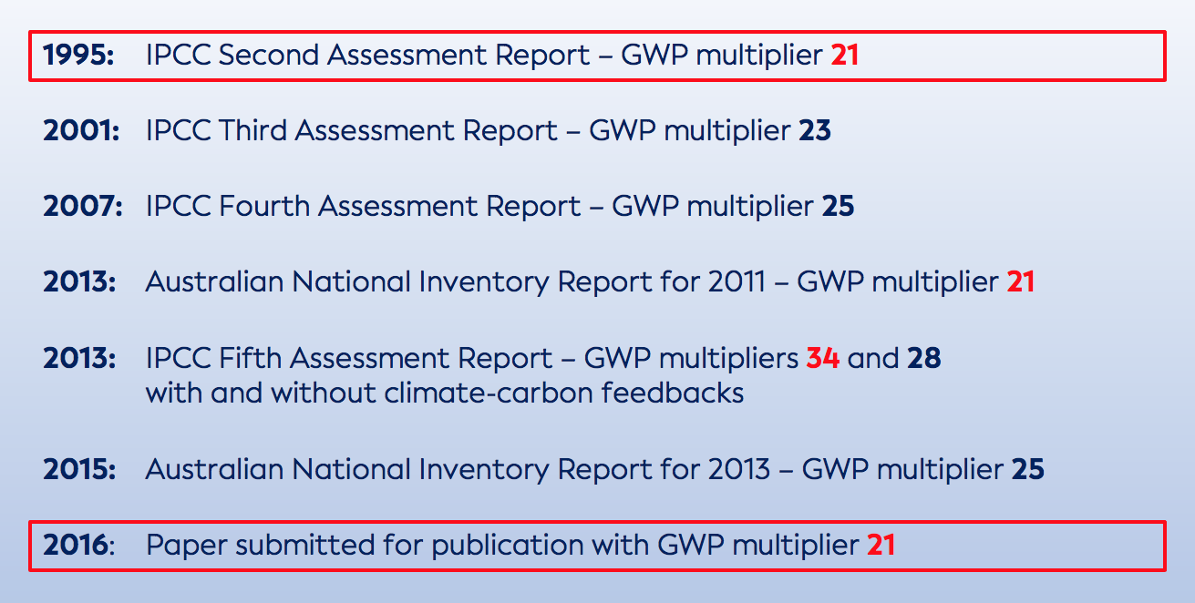 The authors of the journal paper utilised figures from Australia’s national greenhouse gas inventory report for 2011, which was published in 2013. That report, in turn, utilised figures from the IPCC’s 1995 Second Assessment Report.