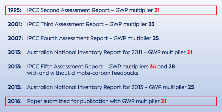 Perhaps the main puzzle involved in this Jigsaw is why the authors of a journal paper submitted to publishers in July 2016 used a GWP multiplier from 1995, rather than the most up-to-date IPCC figure. This article does not speculate on potential reasons.